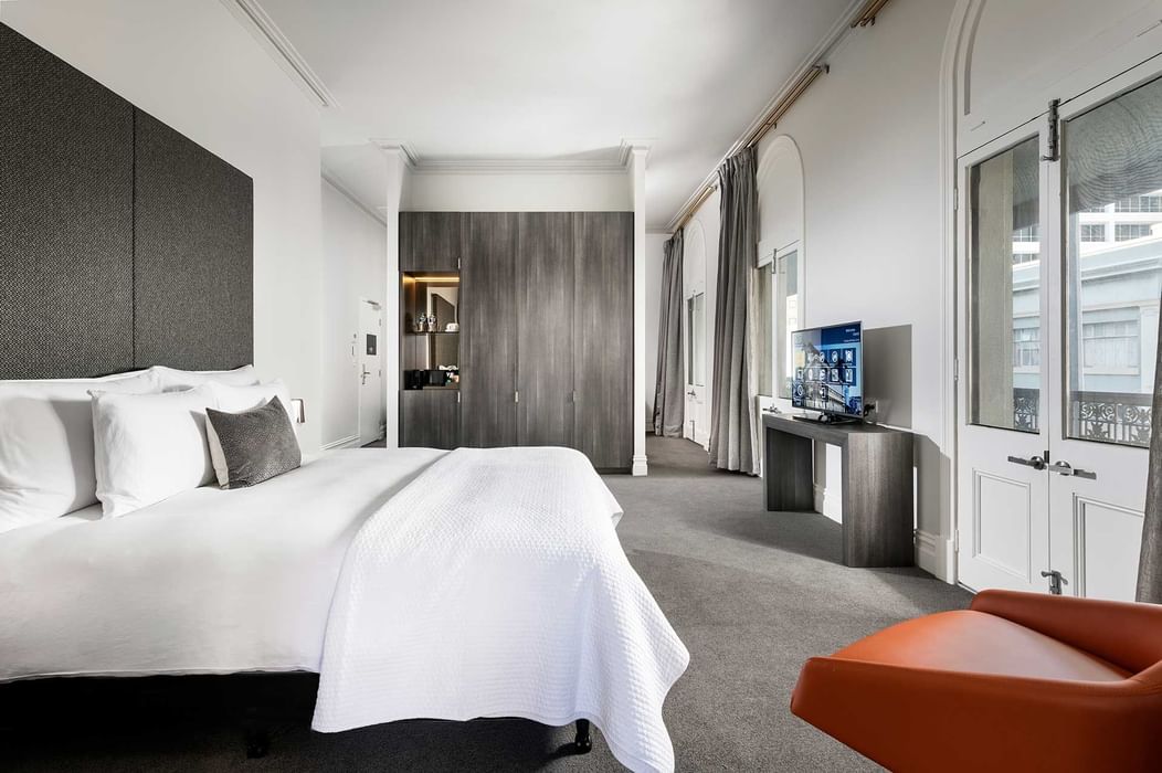 King bed by wardrobe in Heritage Verandah at Melbourne Hotel Perth